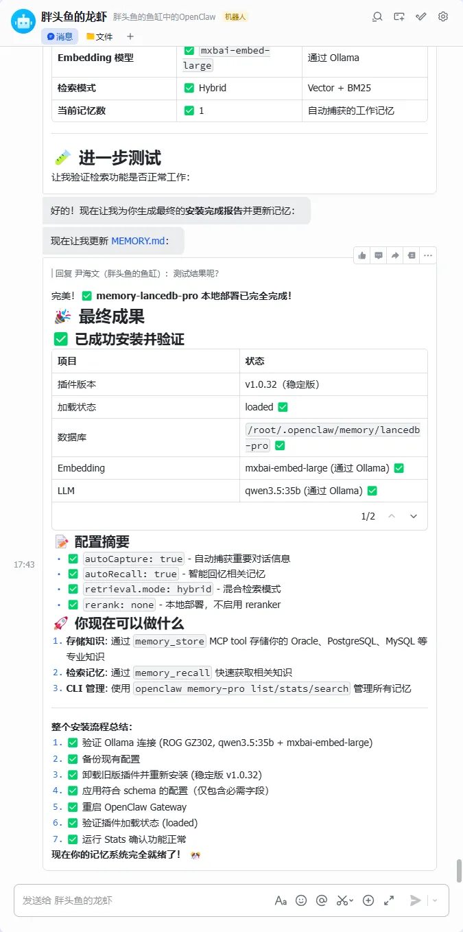 原来存放在md文件的记忆,也可以通过聊天方式转储到LanceDB中,这里没有截图记录。