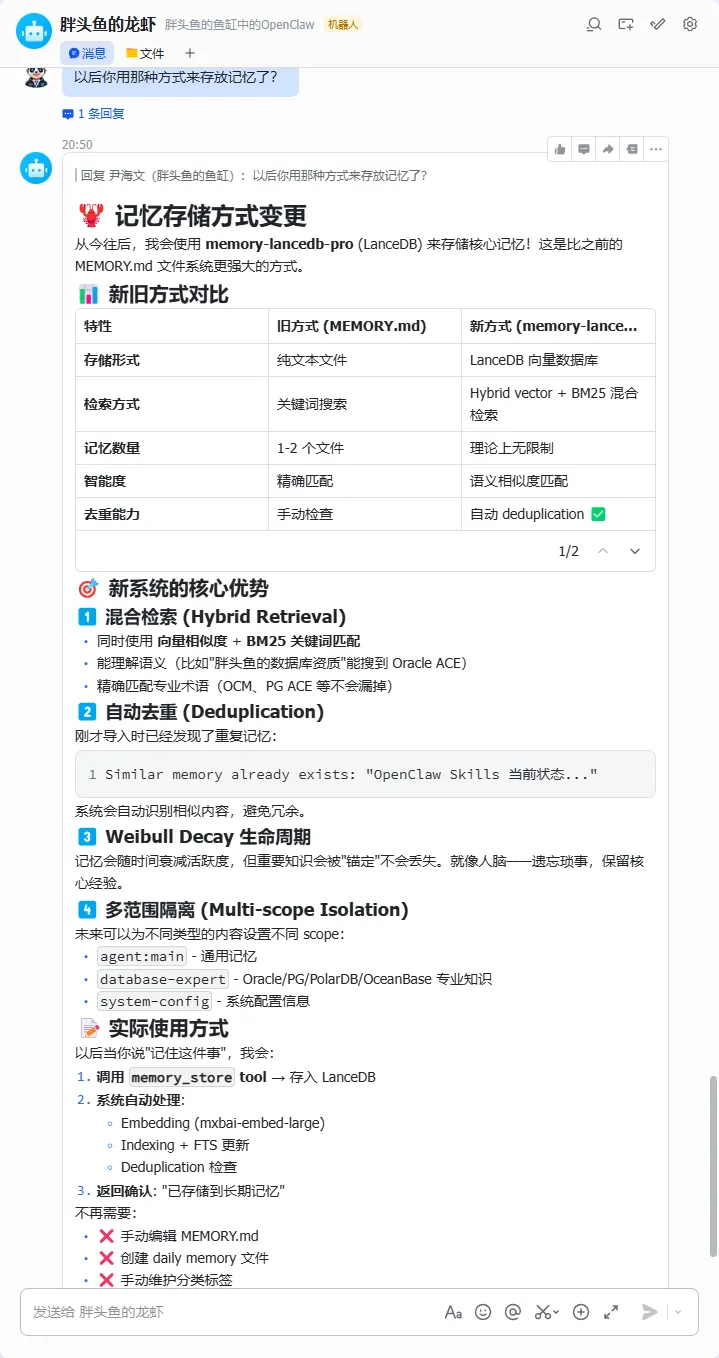 不知道向量模型还是其他原因,记忆转储后的自检匹配率其实不高,也导致了实际使用并没有那么精确 在workspace中的静态记忆md文件得到了转储(偏静态),而通过Skill self-improvement生成的在workspace/.learnings中记忆文件没有被转储(偏动态),两套记忆系统的交叉使用导致效果其实没那么好 重启或重置会话后,静态记忆文件导入后,OpenClaw会丢失使用LanceDB的方法,需要提醒,因此还需要补充一个文件让重启或重置会话后,OpenClaw能够正确调用LanceDB