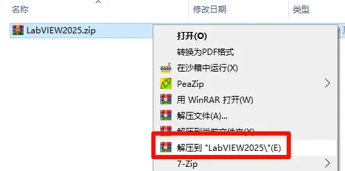 1.打开下载好的文件夹找到压缩包【LabVIEW2025.zip】,鼠标右键选择【解压到LabVIEW2025\】。