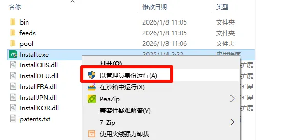 3.找到应用程序【Install.exe】,鼠标右键选择【以管理员身份运行】。