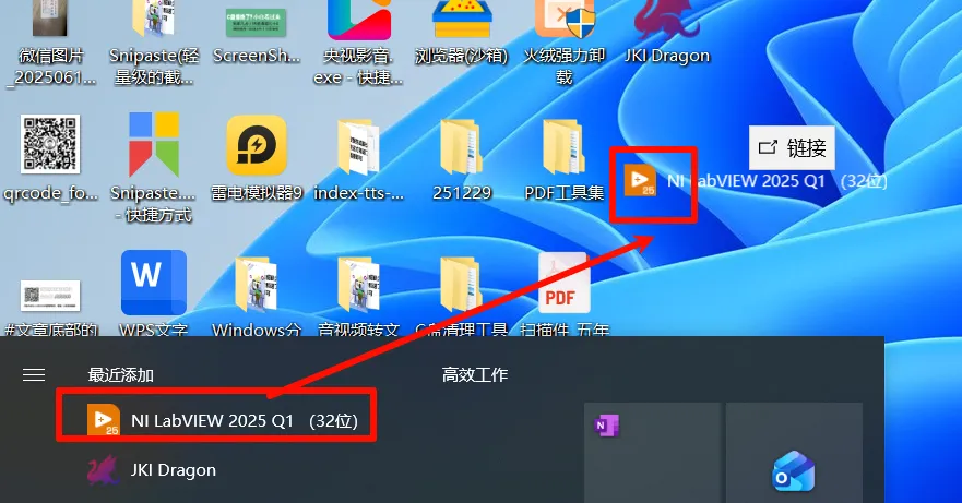 16.创建桌面快捷方式:①点击桌面任务栏中的【开始图标】>点击【所有应用】②将【NI LabVIEW 2025 Q1 (32位)】图标拖到电脑桌面即可。
