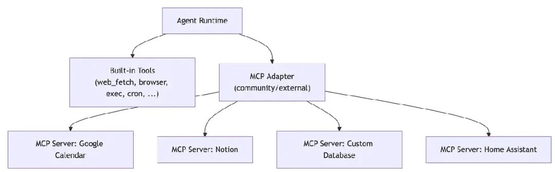 一些 OpenClaw 部署集成了 MCP 服务器作为标准化的工具层,将智能体连接到外部服务,如 Google 日历、Notion、Home Assistant 或自定义 API。项目中原生的 MCP 支持正在积极发展中,社区适配器如今已经使其成为可能。