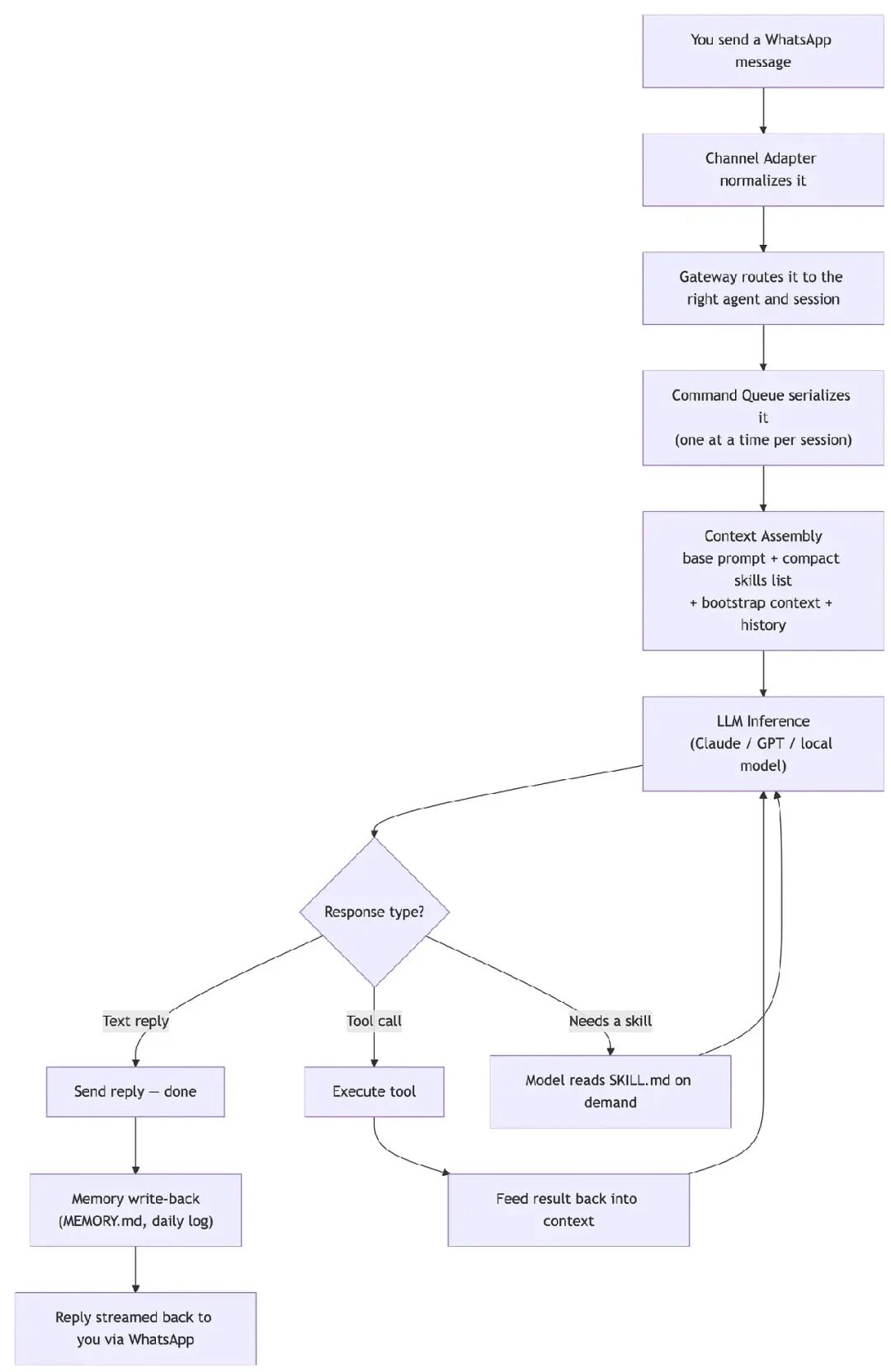 这是第一个值得内化的架构概念:一个真正的 AI 智能体部署总是在模型之前有一个编排层。你不会将原始的 LLM API 调用直接暴露给用户输入。你会在中间放一个受控的进程来处理路由、排队和状态管理。OpenClaw 使这种模式具体化且易于理解。