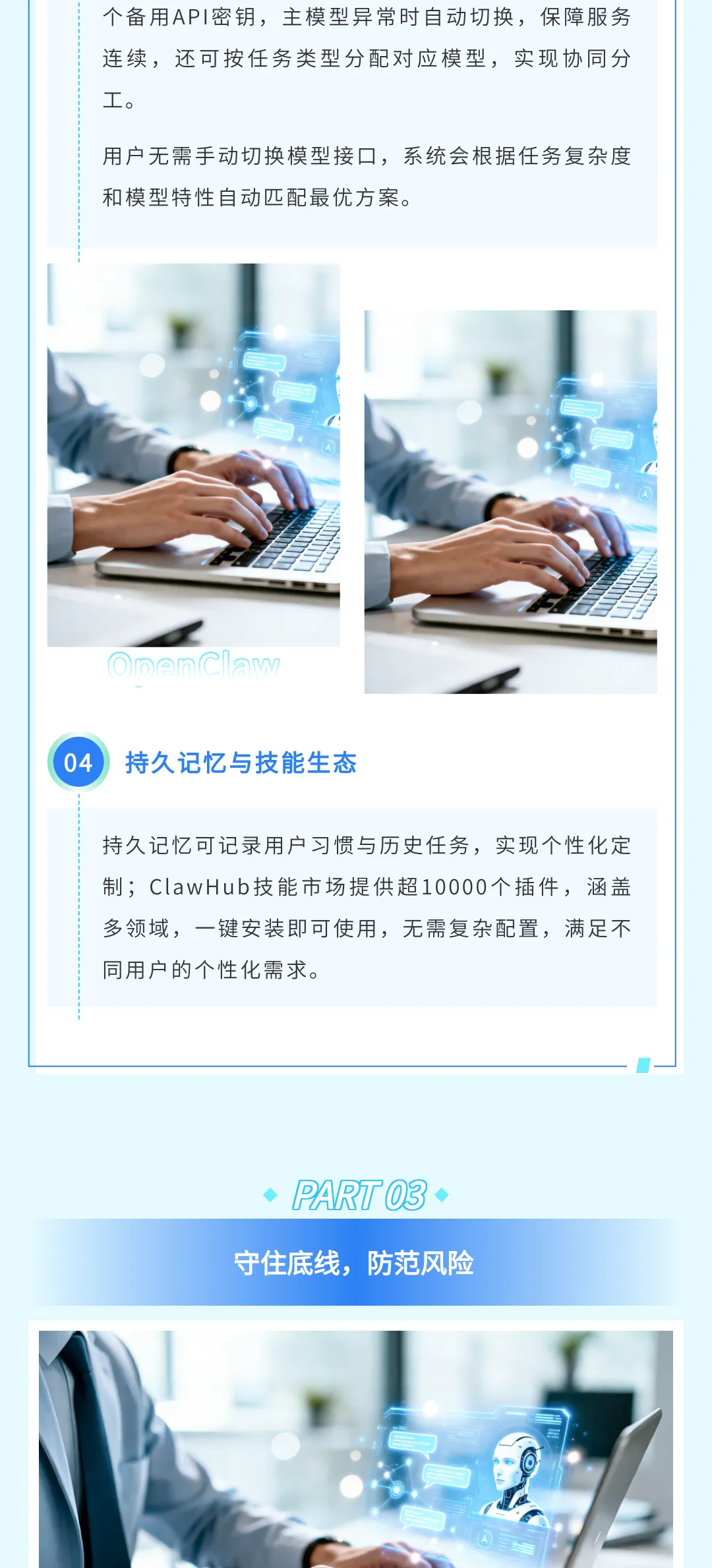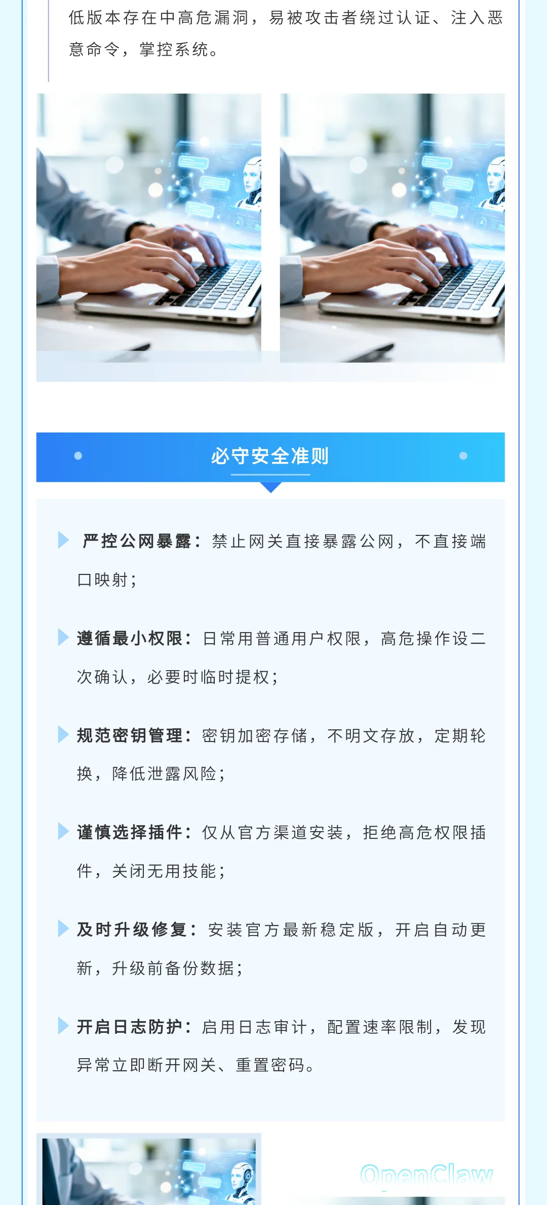 下达指令时,表述清晰、具体,避免模糊化指令,减少AI误操作的概率;不向OpenClaw输入密码、支付账户、核心商业机密等敏感信息。严格管理插件来源,禁用自动更新功能。