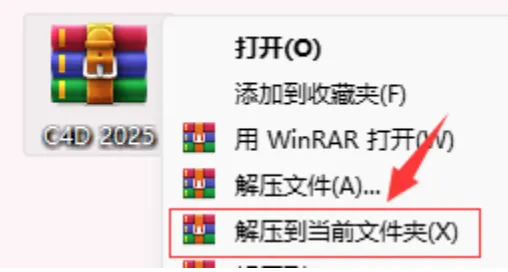 1.找到下载好的C4D 2025安装包,解压安装包:①鼠标右击【C4D 2025】压缩包②选择"解压到当前文件夹"⚪注意:由于压缩包带有激活文件,解压前需关闭杀毒软件