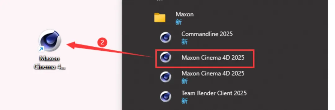 11.创建桌面快捷方式:①点击桌面任务栏中的【开始图标】>点击【全部】>双击展开【Maxon】文件夹②将【Maxon Cinema 4D 2025】图标拖到电脑桌面。