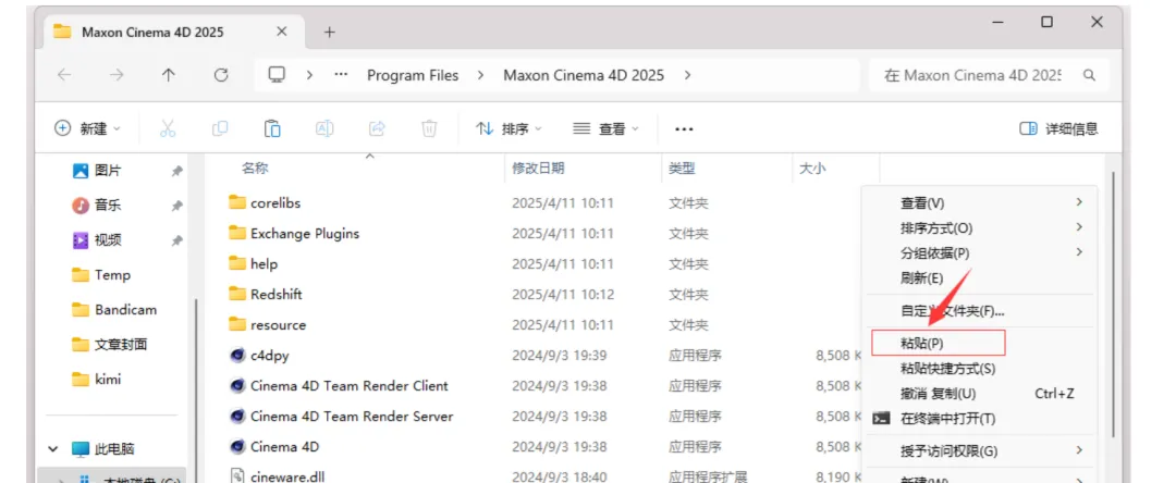 应用破解补丁: 在安装包文件夹内找到 Crack或Patch文件夹,复制里面的resource文件夹(部分版本为.dll文件)。定位安装目录:从开始菜单找到“Maxon Cinema 4D 2025”图标,拖到桌面创建快捷方式。右键该图标,选择“打开文件所在位置” 。 粘贴并替换:在打开的安装目录空白处右键,选择“粘贴”,点击“替换目标中的文件” 。 验证:双击桌面快捷方式启动C4D 2025。若能正常进入主界面,且无许可证报错,则软件已成功永久激活 。