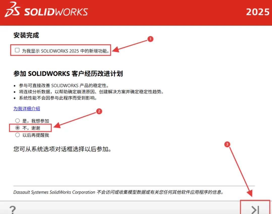 22.取消勾选为我显示 SOLIDWORKS 2025中的新增功能,选择 不,谢谢,点 “完成”