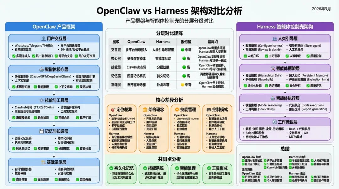 两者在持久化记忆、模块化技能、大模型推理与工具集成上具备共性,但核心差异显著:OpenClaw 🦞侧重用户驱动、自主决策与社区化扩展,Harness 强调人类主导、受控执行与质量保障。整体来看,OpenClaw 🦞面向通用个人与日常场景,追求自主性与通用性;Harness 面向专业研发与团队协作,追求可控性与规范性。二者分别代表了智能体 “自主服务” 与 “受控辅助” 两大技术路线,可根据使用主体、控制需求与业务场景灵活选用。