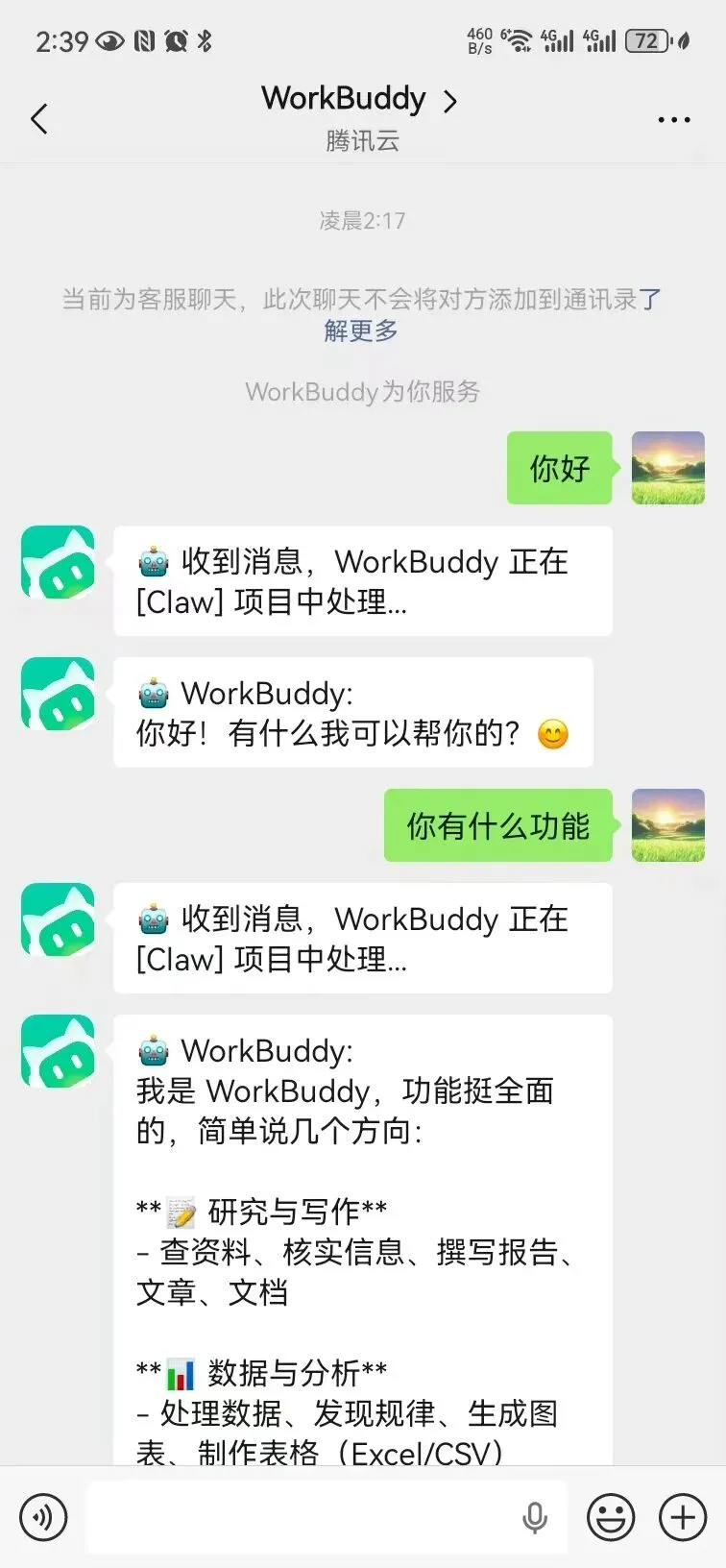 腾讯版OpenClaw快速本地部署教程,一键接入个人微信!腾讯推出了多款OpenClaw 产品,有腾讯云的轻量服务器方案,有目前在内测的QClaw 方案,今天测试了腾讯Workbuddy里的Claw产品,发现其也是十分的容易上手,话不多说,我们来体验一下!首先浏览器进入Wordbuddy下载官网:https://copilot.tencent.com/work/点击下载Wordbuddy。下载和安装过程十分简单,就不多说了。安装好之后,进入WorkBuddy。点击Claw右边的齿轮图标,打开设置。然后点“微信客服号集成“右边的配置,然后用自己的个人微信扫码绑定。绑定后是这样的:到这,就已经接入微信设置好了,我们到微信里面看到一个WorkBuddy客服消息,如下图:你现在可以在微信这里给WorkBuddy发消息,体验它的功能了!
