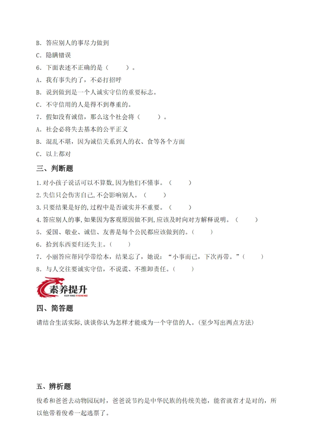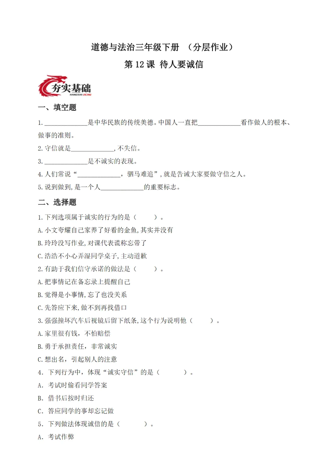 三年级(下)道法 第12课 待人要诚信(分层作业)