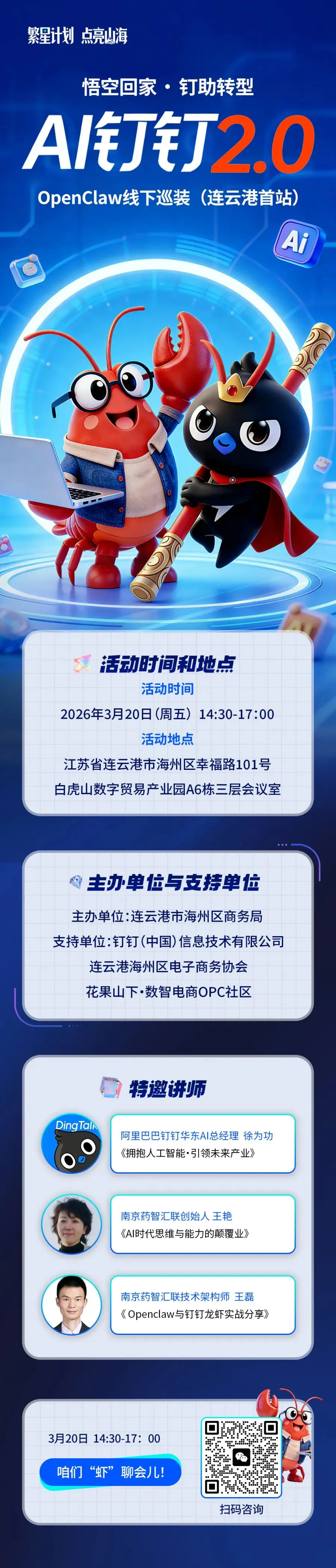 恰逢阿里巴巴钉钉“悟空”平台发布暨OpenClaw线下巡装全国首站落地连云港,海州区商务局牵头开展openclaw+电商+安全专题培训,聚焦电商企业AI实操与安全运营,手把手教你玩转AI,筑牢安全防线!