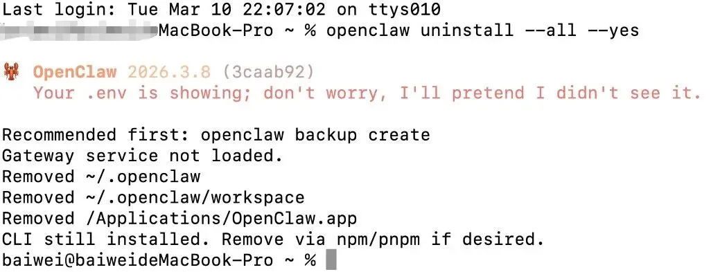 如果想把它彻底清除,再执行一行——代码块:npm uninstall -g openclaw。