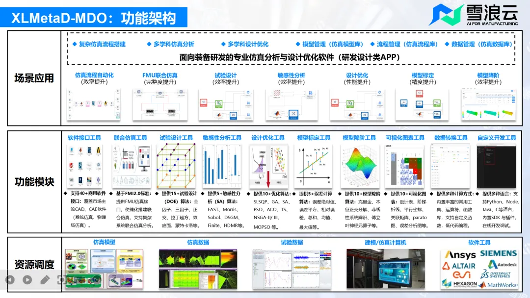 在CAE方面雪浪云提供云原生的XLMetaD-MDO多学科设计优化(MDO)软件,对接了40多款CAE软件,相比于HEEDS等传统架构MDO软件,具备云端部署协同高效、最佳研发实践固化、组件工具扩展灵活、建模分析算法丰富等特点,在航空航天、工程机械、能源装备、高校院所等领域沉淀超过20+典型应用案例。