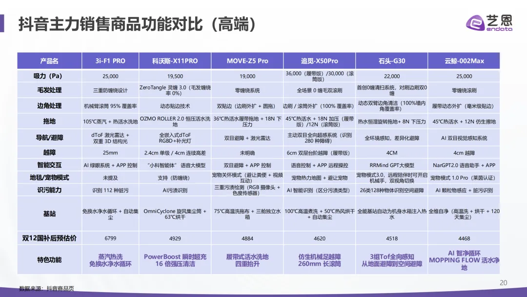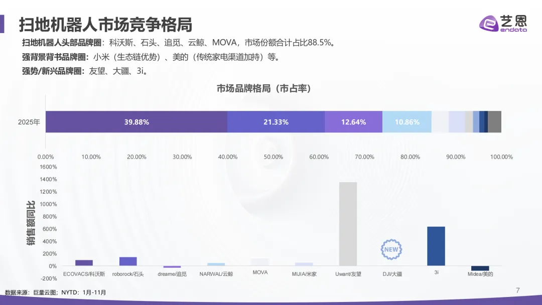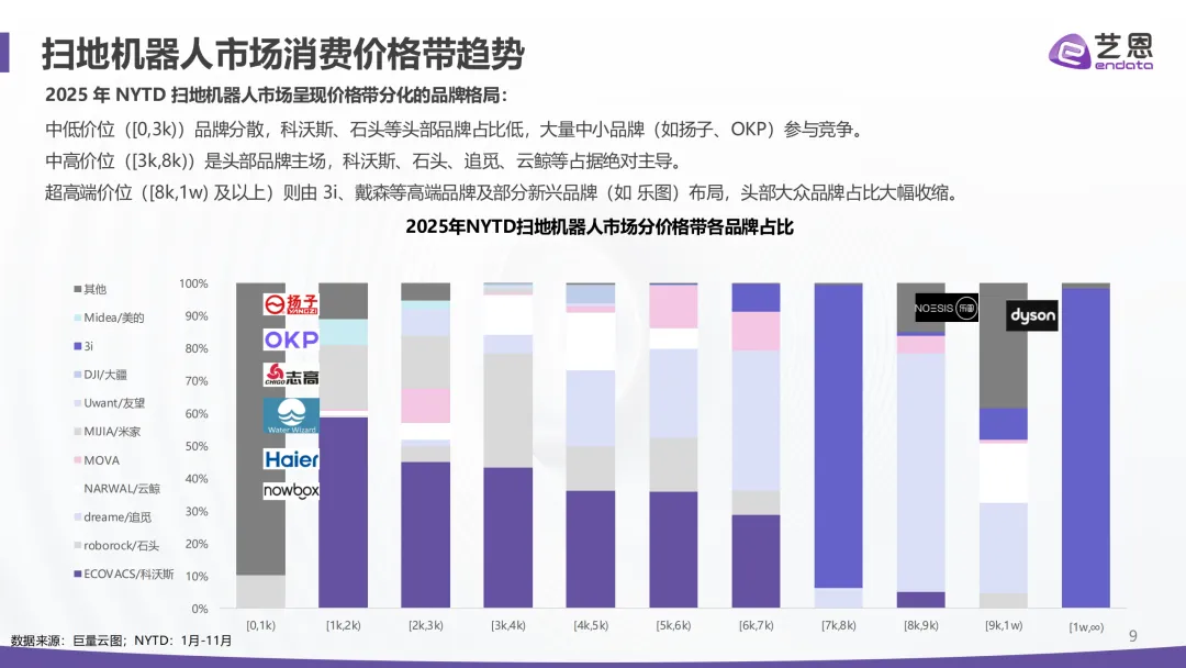 核心驱动主要是国补政策加持和大促节点拉动,单看1-11月,销售额就同比增长了50.97%。价格上则是消费明显向中高端迁移,3k-4k价位段成为核心增量区间,彻底改变了以往低价主导市场的格局,搭配AI避障、自动换拖布等热门功能的中高端机型更受青睐。