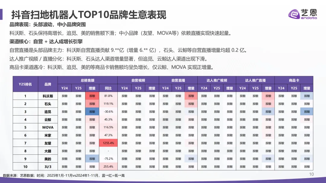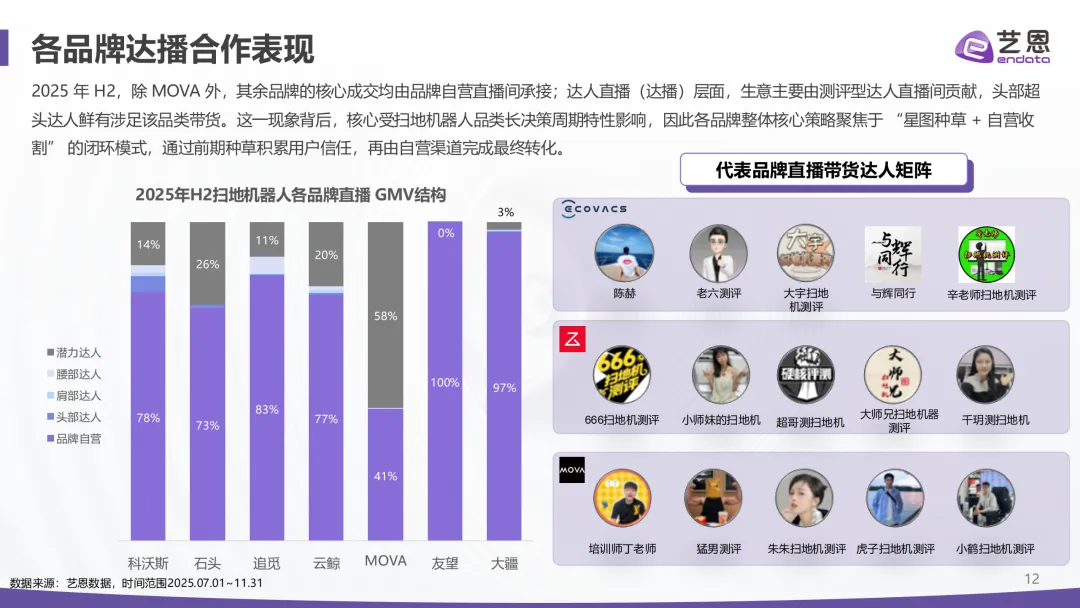 品牌格局呈现头部垄断态势,科沃斯、石头、追觅、云鲸、MOVA这五大头部品牌,合计占比达到88.5%,牢牢掌握市场主动权。新兴品牌没法正面抗衡,只能在细分价位和细分场景里突围。渠道增长的核心是自营直播,头部品牌的自营直播贡献了主要增量,反观商品卡渠道,整体表现冷淡,没能形成有效增长。