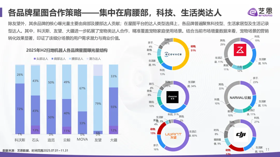 单品转化的关键的是高频曝光,曝光次数达到13次以上的人群,贡献了80%以上的成交。主流营销模式还是星图种草加自营收割,大多聚焦肩腰部的科技或生活达人,尤其是宠物家庭这类细分场景,结合分区清洁、防毛发缠绕等热门需求,转化效率特别高。