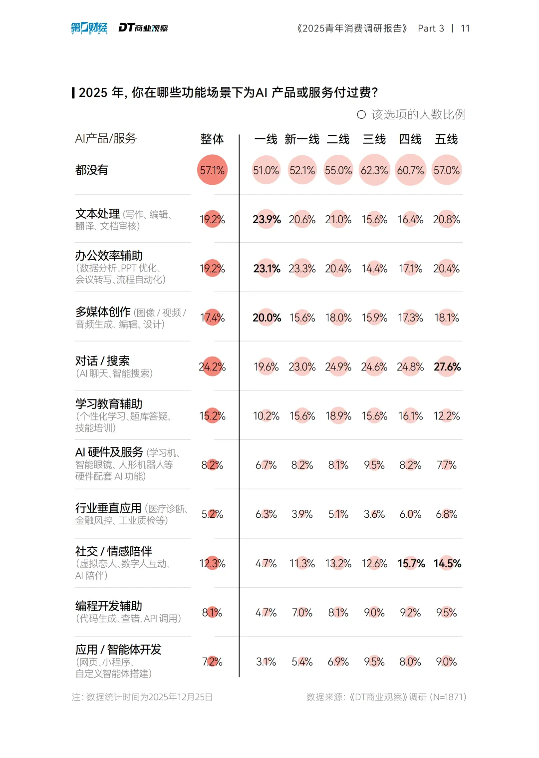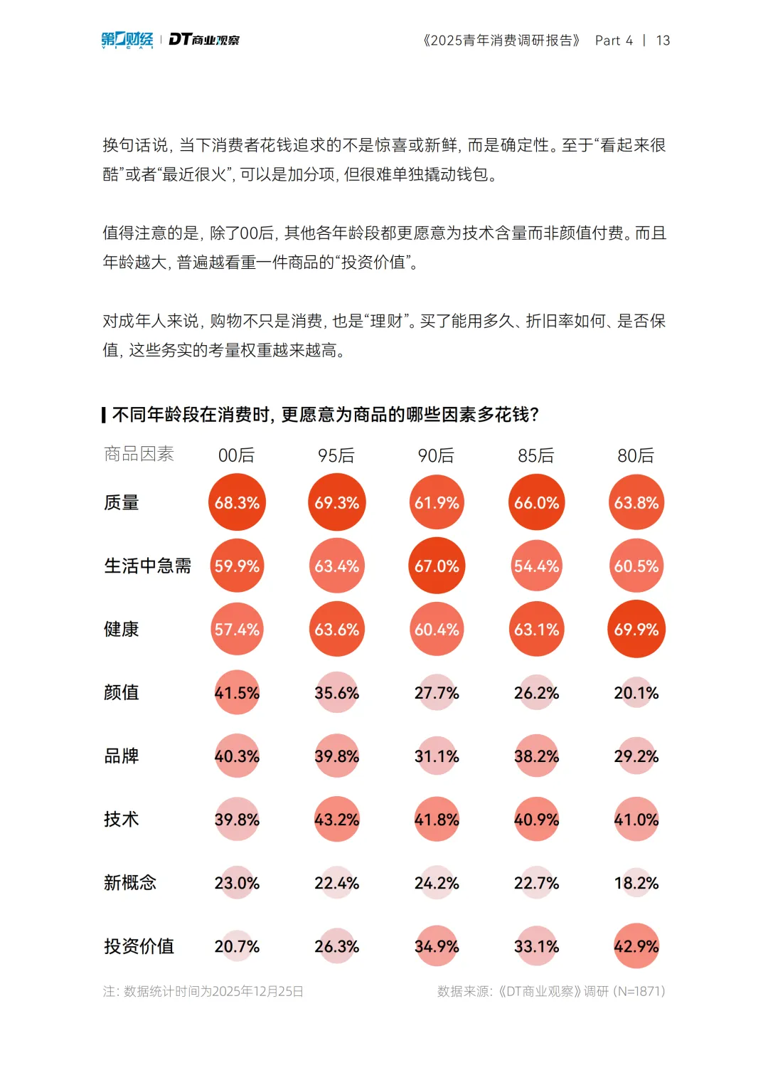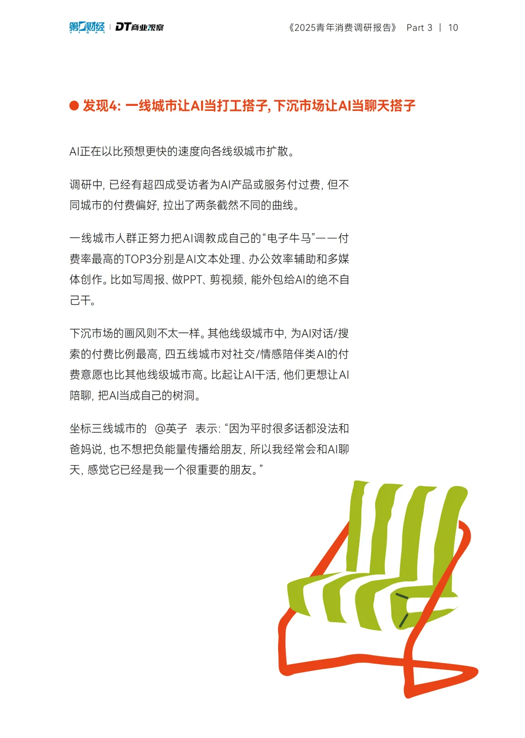 资金投放很有针对性,旅游、户外等体验类消费领跑,契合年轻人追求情绪释放的需求,这也是青春经济的重要体现;食品饮料、服饰等基础消费不可或缺;营养品、保健品则成为年轻人的新刚需,“保命式养生”成为潮流。美妆个护触底回暖,下沉市场成了主要增长动力;AI消费也出现分化,一线城市青年用它提升效率,下沉市场则更看重其陪伴功能。核心趋势就是体验、健康、理性三者并行,每一笔消费都追求实实在在的价值。