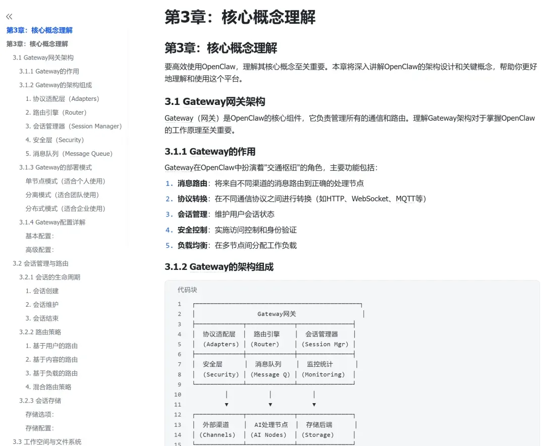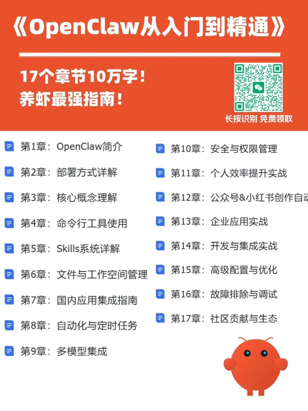 第1章:OpenClaw简介第2章:部署方式详解第3章:核心概念理解第4章:命令行工具使用日第5章:Skills系统详解第6章:文件与工作空间管理第7章:国内应用集成指南第8章:自动化与定时任务第9章:多模型集成第10章:安全与权限管理日第11章:个人效率提升实战日第12章:公众号&小红书创作自动化实战三第13章:企业应用实战第14章:开发与集成实战第15章:高级配置与优化第16章:故障排除与调试第17章:社区贡献与生态