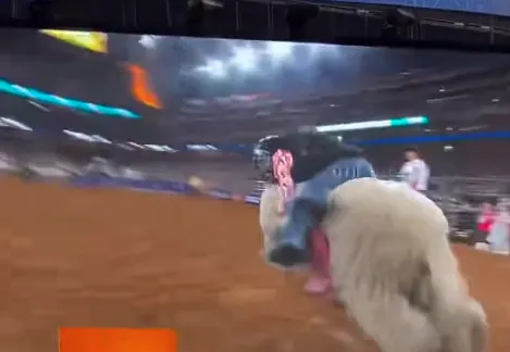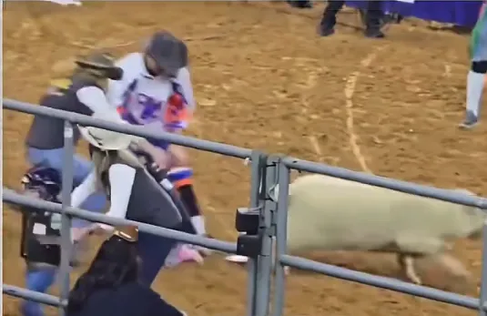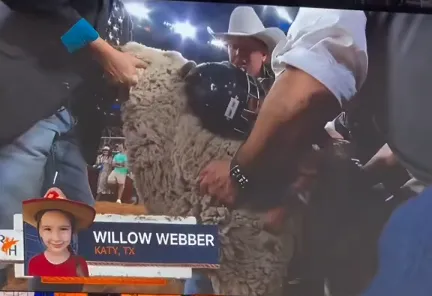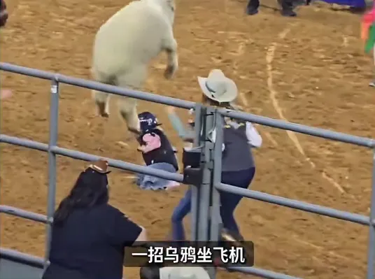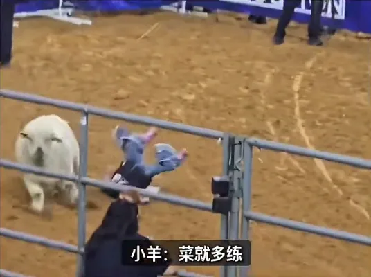 美国一场骑羊比赛上,一小女孩没抓住,从羊背上摔了下来,下一秒还被小羊嘲讽。