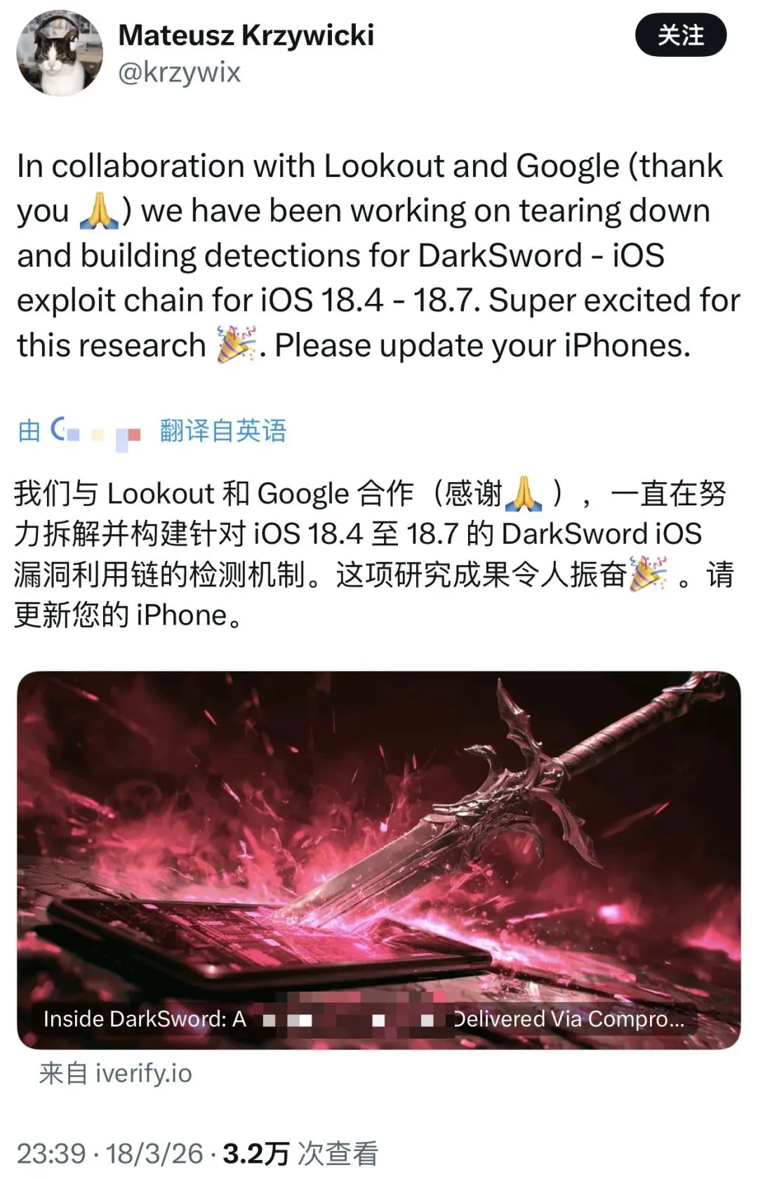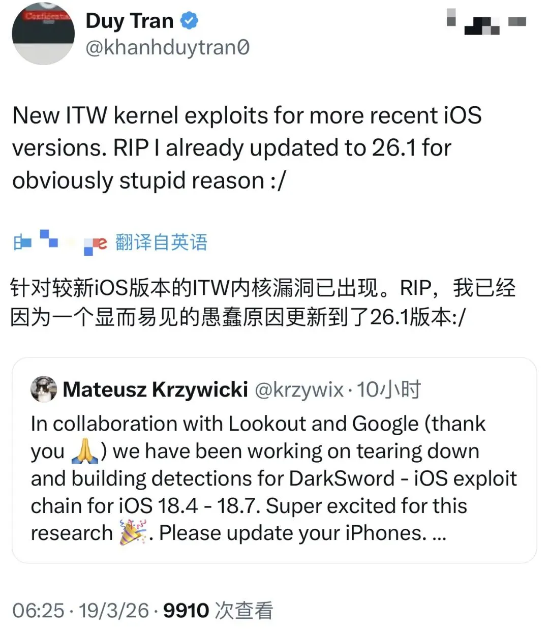 劲爆!iOS 18.4~18.7发现新漏洞昨天越狱社区传来重磅消息!iOS 18.4至18.7发现新漏洞,或有利于往后iOS 研究。随后社区大佬:Duy Tran 对此评论,语气中好像后悔升级26.1了。目前iOS 17.0.1至17.2.1用Coruna漏洞网页可注入少量dylib插件。iOS 18.4至18.7也发现新漏洞带来了点点希望!仅处于发现阶段,后续也许会带来更多…图片:来自网络