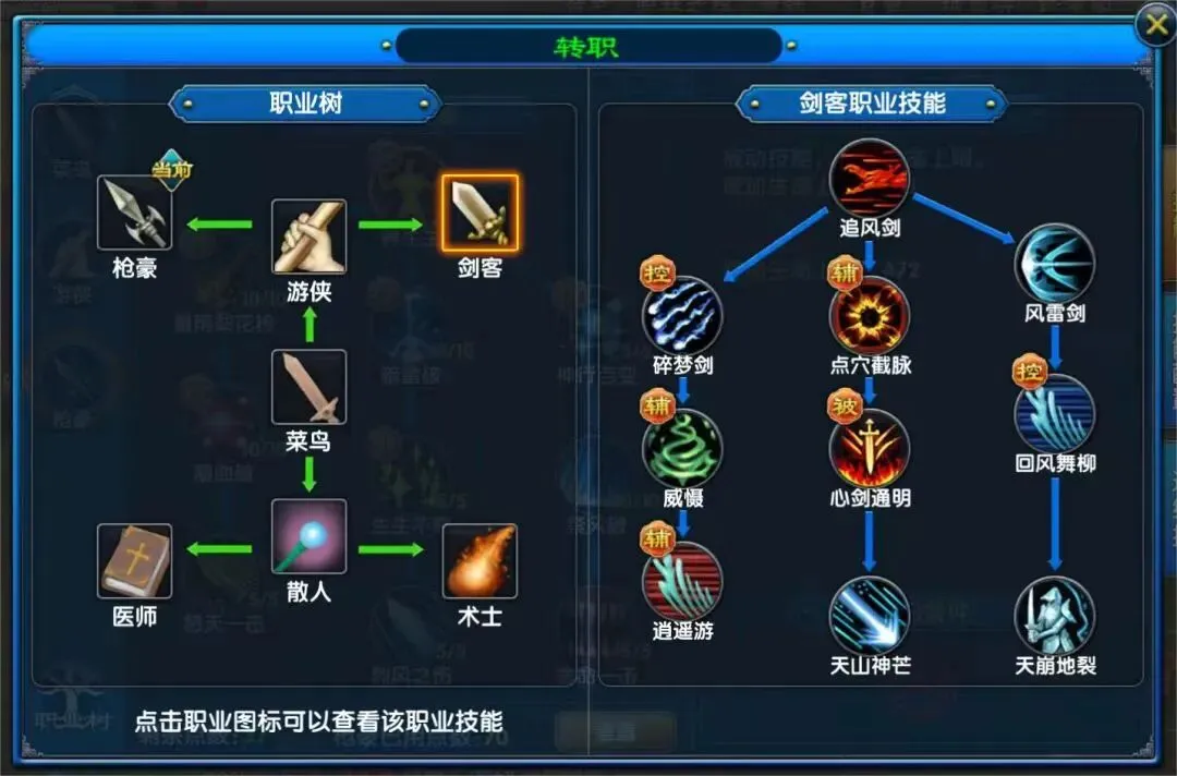 游侠一转后的剑客,身手灵动、暴击率出众,核心技能“回风舞柳”不仅拥有120°范围群攻效果,还附带沉默控制,在PVP对战中能轻松压制敌方脆皮。二转解锁剑圣或邪皇后,更是成为近战玩法的绝对霸主,适合追求高操作的玩家。
