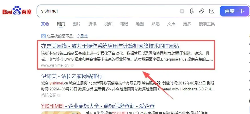 1.打开百度搜索“yishimei”,选择下图中的网址进入下一步