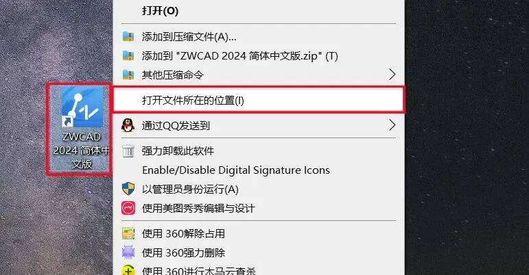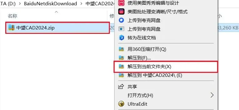 1.打开下载的中望CAD软件安装包,鼠标右击压缩包选择【解压到当前文件夹】。
