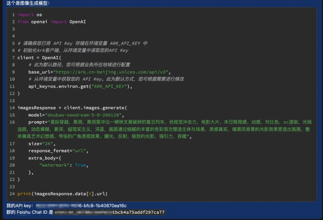 然后它就开始开发并检测了摄像头和拍照功能,测试以后没问题,又看了下这个需求,说,还需要生图模型、飞书群的Chat ID以及生图模型的API Key。