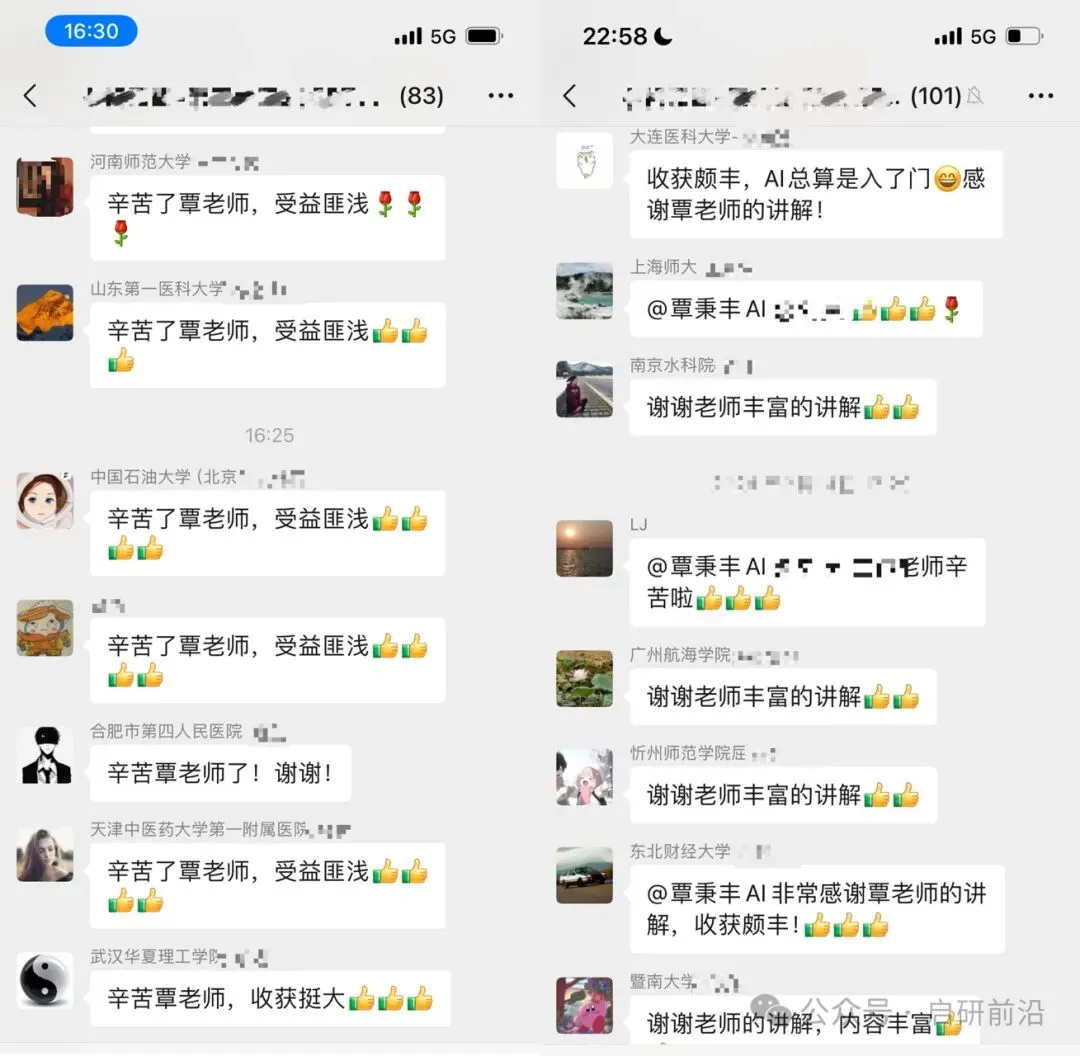 一年内免费复训 — 相同课程一年内可免费重复参加,课程内容持续迭代更新,每次复训都有新收获。 每月前沿直播 — 一年内免费参加每月2次"AI+科研"前沿应用直播,紧跟最新工具更新与实战技巧。 永久答疑支持 — 课后遇到任何技术问题可随时联系讲师一对一交流,没有"售后期限"。 完整视频回放 — 培训结束后提供全程高清视频回放,方便反复学习与随时查阅。