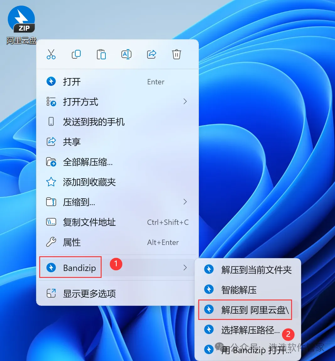 1、下载阿里云盘软件安装包到电脑上,右键选择【解压到阿里云盘\】