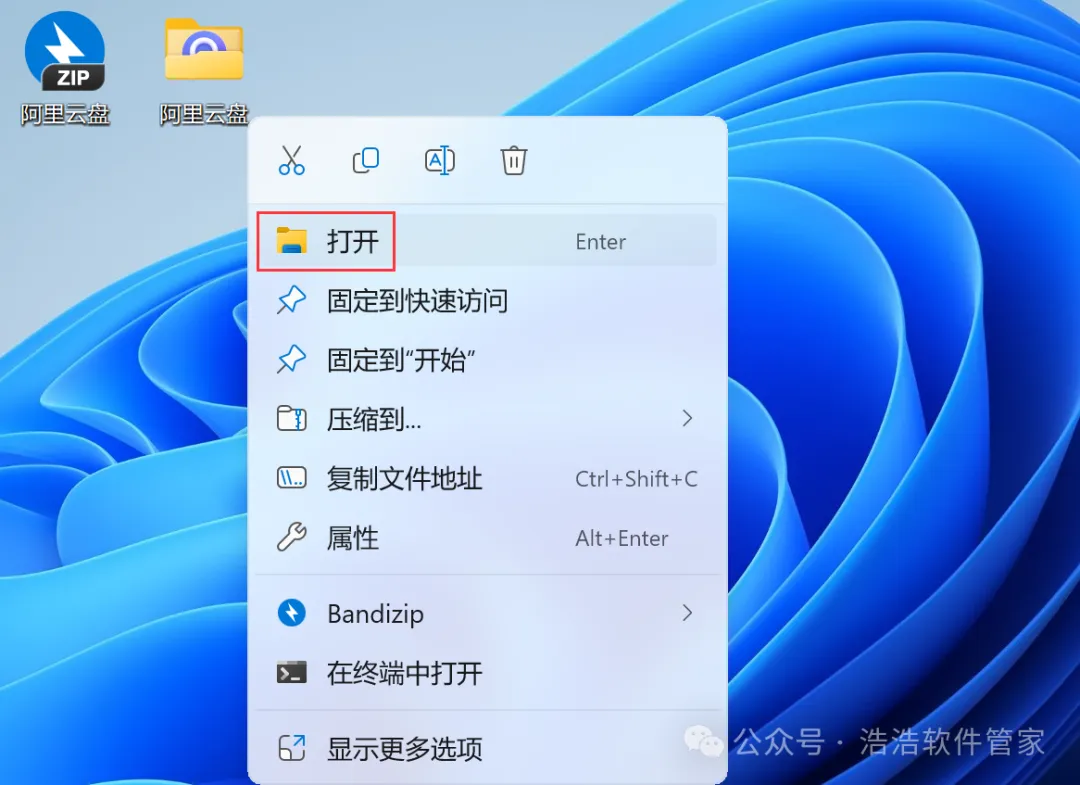 8、回到桌面,右键桌面上的【阿里云盘软件图标】,点击【打开】
