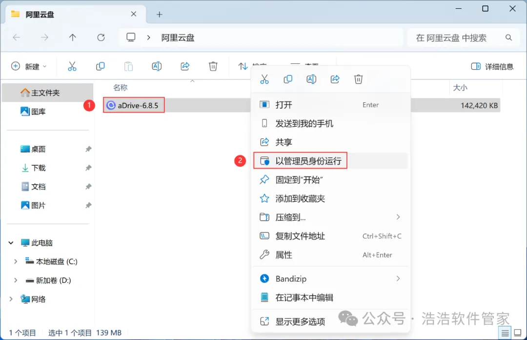 3、找到【阿里云盘】应用程序,右键选择【以管理员身份运行】它