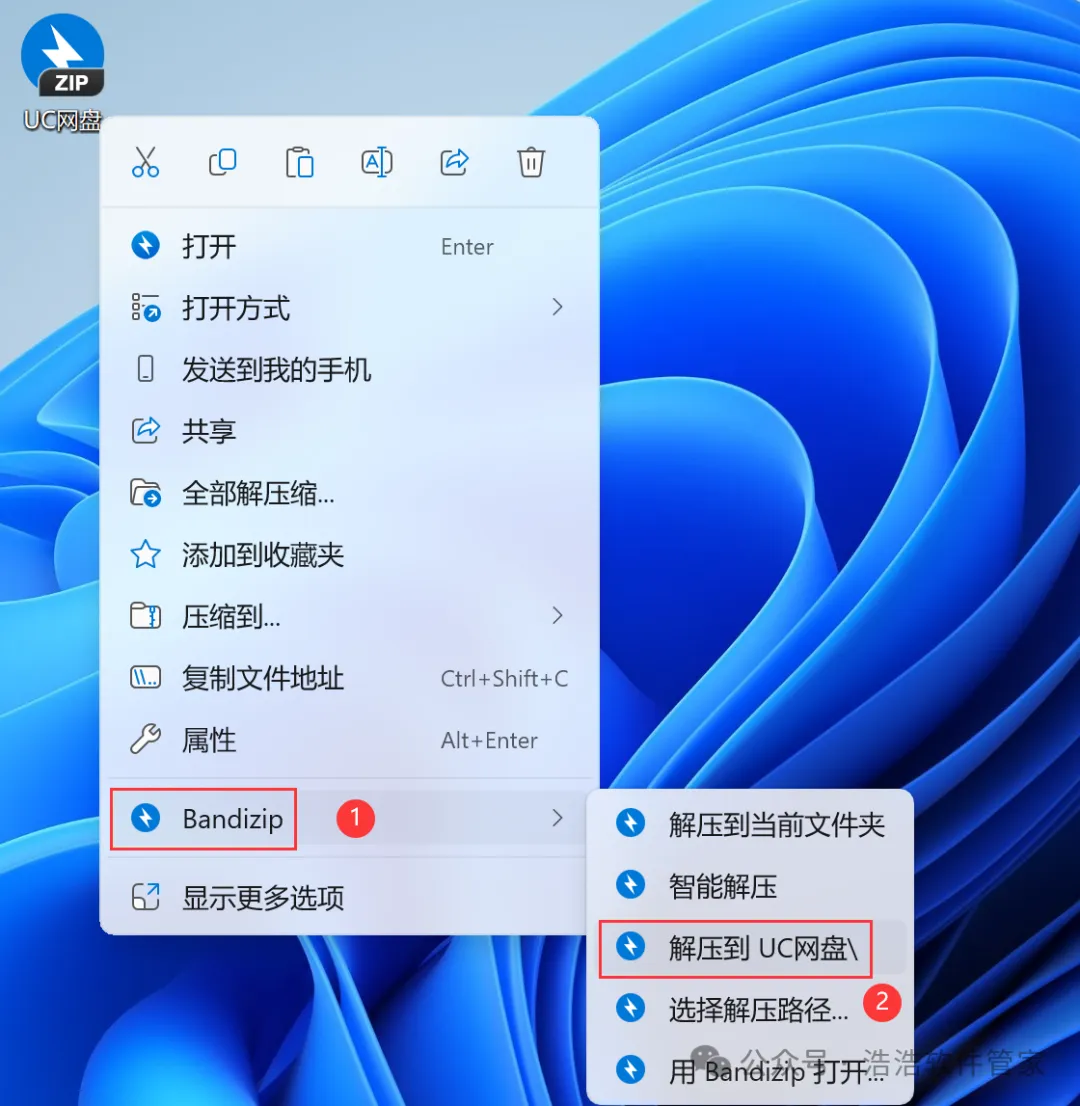 1、下载UC网盘软件安装包到电脑上,右键选择【解压到UC网盘\】