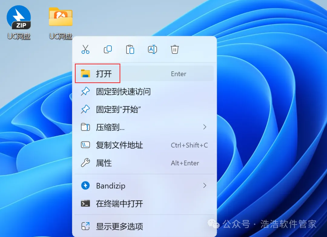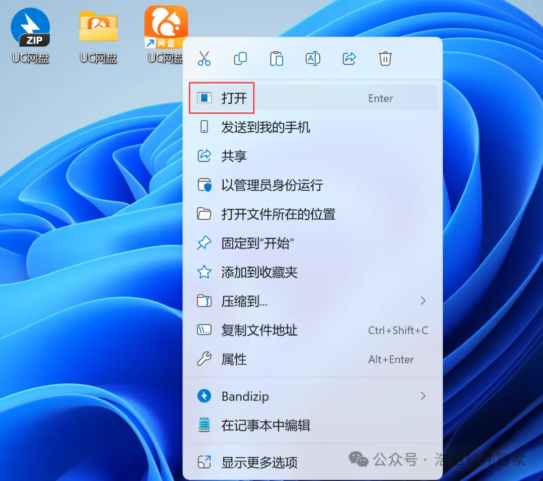 8、回到桌面,右键桌面上的【UC网盘软件图标】,点击【打开】