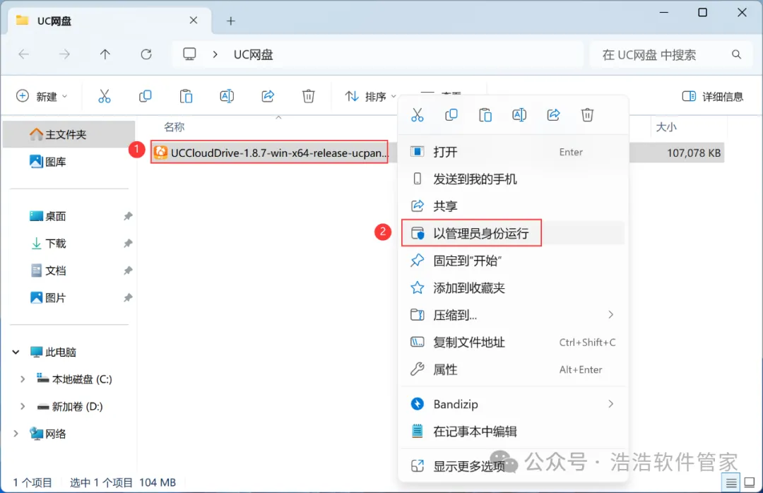 3、找到【UC网盘】应用程序,右键选择【以管理员身份运行】它