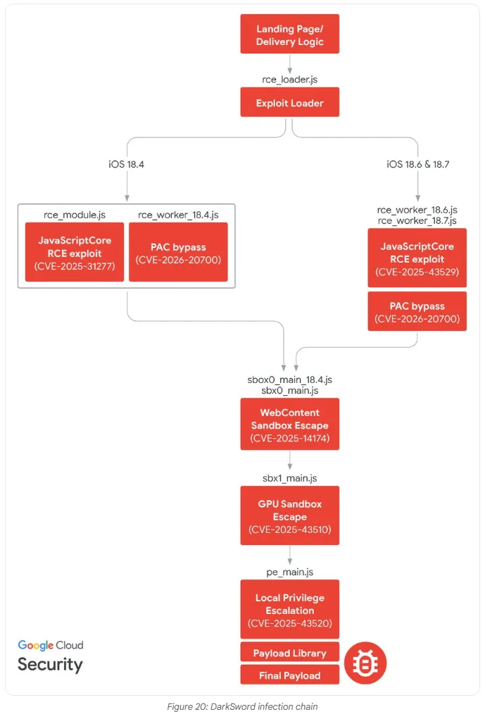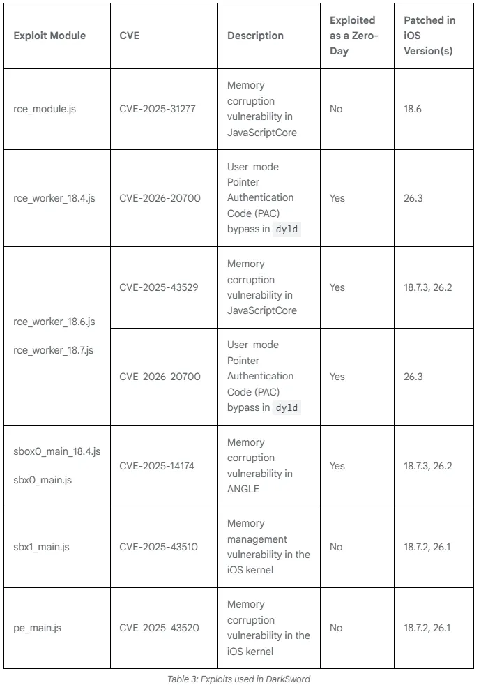 具体的目标漏洞包括CVE-2025-31277、CVE-2025-43529、CVE-2025-14174、CVE-2025-43510、CVE-2025-43520和CVE-2026-20700。