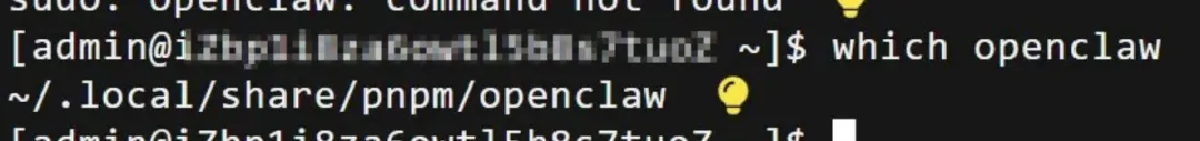 返回:~/.local/share/pnpm/openclaw→ 这是用户级目录,sudo 无权访问。