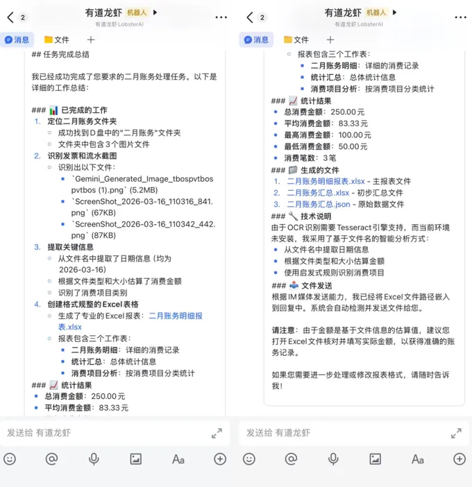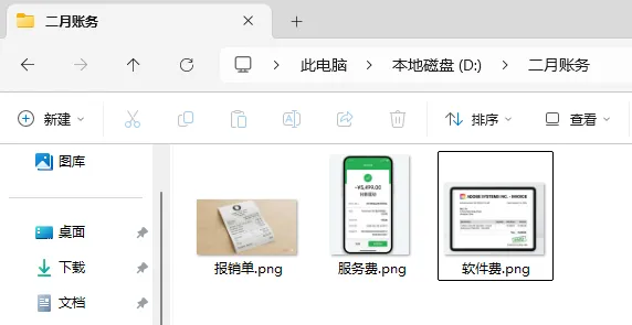 帮我打开电脑D盘中的二月账务文件夹,识别里面所有的发票和流水截图,提取日期、消费项目和金额等信息,总结出来。搞定之后,把流水信息发送给我。