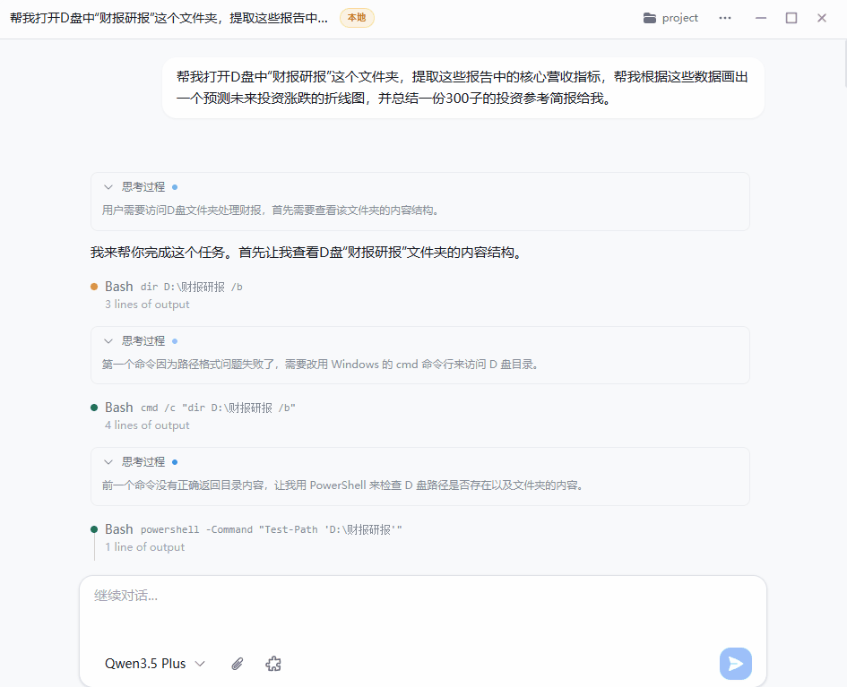 帮我打开D盘中“财报研报”这个文件夹,提取这些报告中的核心营收指标。帮我根据这些数据画出一个预测未来投资涨跌的折线图,并总结一份300字的投资参考简报给我。
