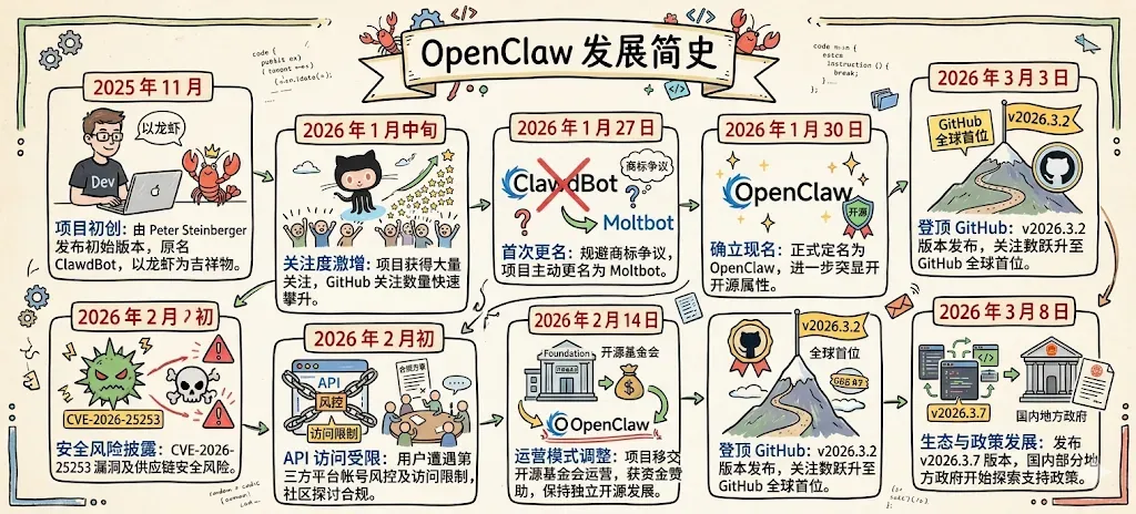 2025年11月 | 项目初创。由开发者Peter Steinberger发布初始版本,原名ClawdBot,以龙虾为项目吉祥物。 |