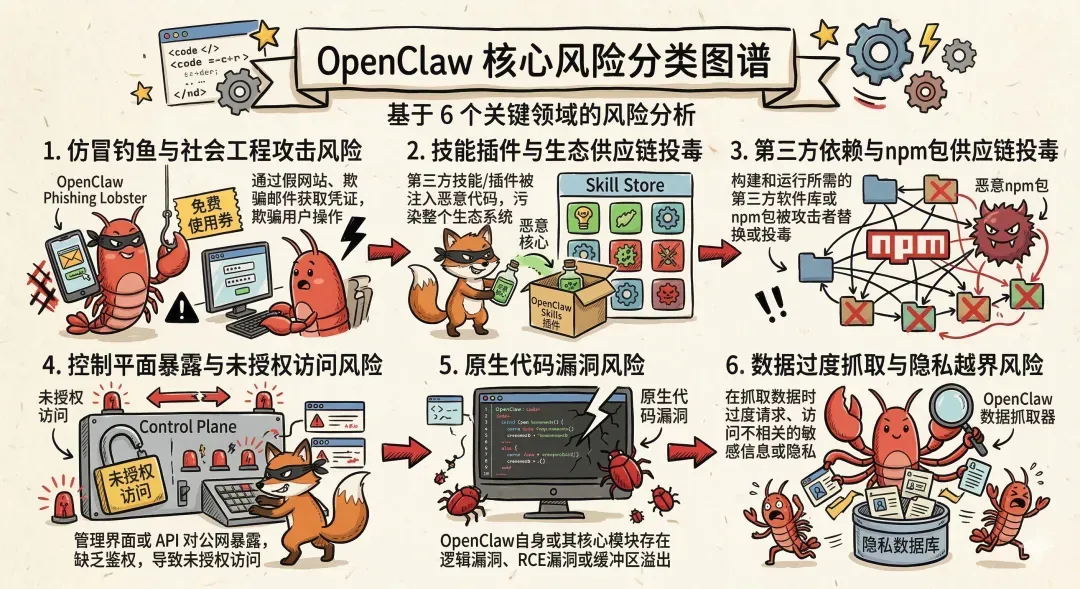攻击者利用OpenClaw生态上下游的开源分发渠道、依赖库体系的开放性,通过投毒恶意组件、篡改合法包、植入恶意脚本等方式,实现恶意代码的规模化传播,属于典型的供应链安全威胁,是OpenClaw生态最突出的基础风险