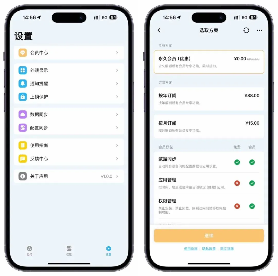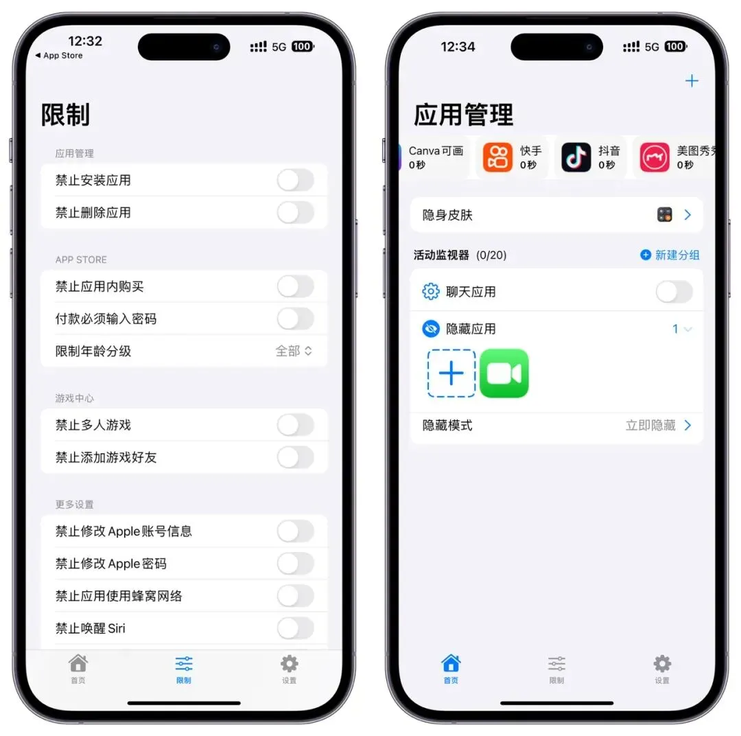 一款应用管理与权限设置工具,适合个人和家长管理设备的使用、保护个人的隐私安全,支持添加多个配置,在需要的时候一键启用,主要功能:锁定应用:阻止使用指定的应用或整个。隐藏应用:将指定的应用从设备上隐藏。,在进入或离开指定区域时,自动锁定(隐藏)应用,场景举例:进入学校时,自动锁定(隐藏)设备上的游戏应用。回到家里时,自动解锁(恢复)应用。在指定的时间段,自动锁定(隐藏)应用,场景举例:在 22:00-06:00时段自动锁定所有应用,避免熬夜上网,管理设备权限,帮助用户在特定场景限制设备的访问权限,更多限制:禁止安装/删除应用,禁止应用内购买,支付必须使用密码等等