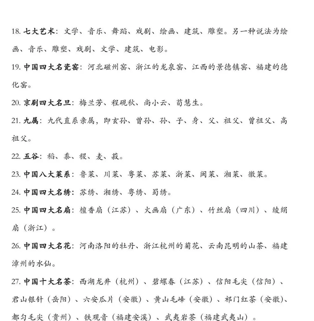 这份整理覆盖文学文化、历史、地理民俗、科学数理、生活安全、艺术体育与国际常识六大核心模块,贴合中小学新课标要求,兼顾课内考点与课外素养拓展,内容系统、重点突出,方便日常积累与备考复习。