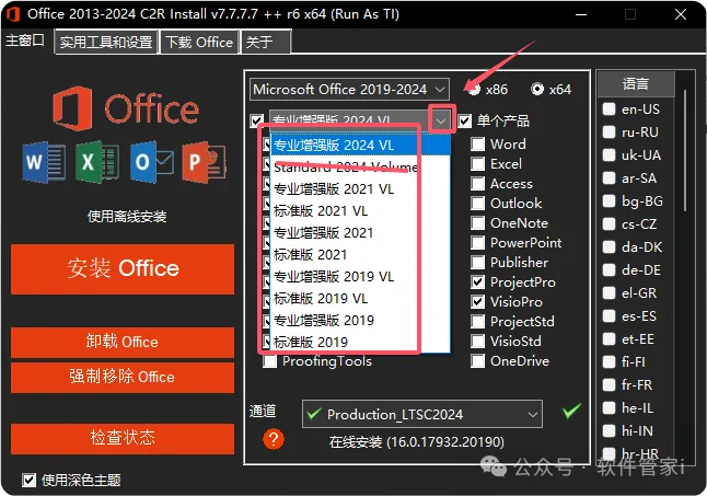 4. 请挑选您需要的版本和相应的Office套件(请注意,Standard 2024版本不可安装)。