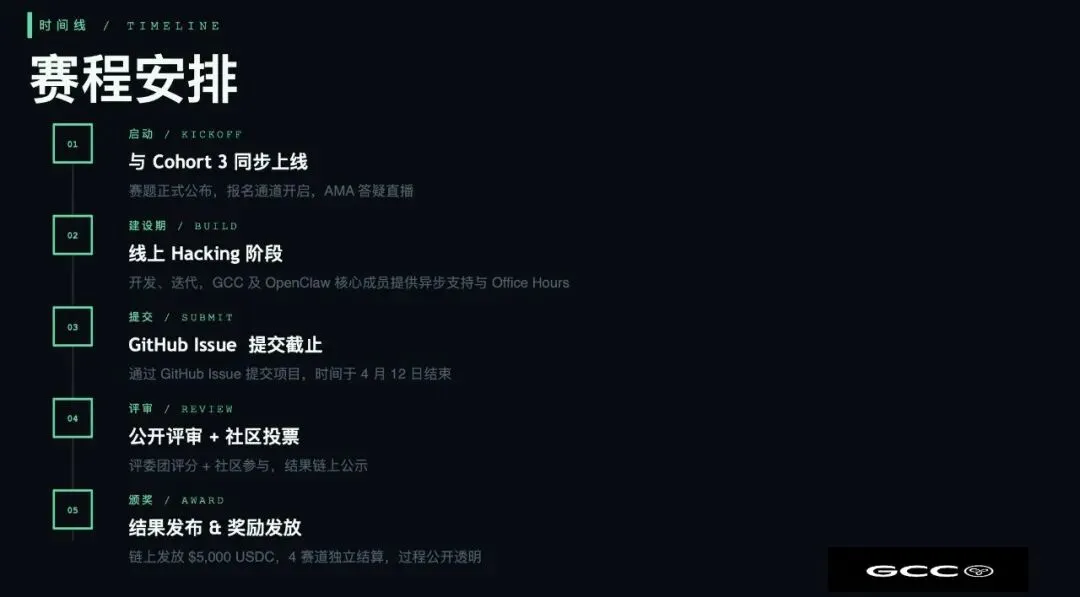 OpenClaw 黑客松:龙虾与公共物品的相会六周前,一个叫 OpenClaw 的开源项目在 GitHub 积累了 160,000 颗 Star。 在它之上的仓库,只有 Linux、Vue、React、Next.js,而它们都有超过十年的历史。OpenClaw 用六周做到了同样的事。 我们在看到这个数字的时候,讨论的方向不是"这个工具怎么用",而是:这件事到底意味着什么? 一个反复出现的问题 GCC 是首个华语公共物品捐赠基金。过去两年,我们资助了 45+ 个项目,累计捐赠超过 $115 万美元,方向覆盖隐私与安全、开源软件、去中心化治理,以及社科人文研究。 提案太多,读不过来。资金发放依赖人工一个个核查。项目进展很难持续追踪,靠的是人的记忆和偶尔的更新邮件。日常运营里有大量重复性的事务,会议纪要、多平台同步、任务提醒,这些事情每周消耗大量的时间,但几乎没有创造性价值。 这些不是 GCC 独有的问题。几乎是所有认真运作的组织都在同样的地方卡着。 我们知道问题在哪,但长期没有顺手的工具。直到 AI Agent 开始变得真实可用。 为什么是现在 OpenClaw 代表了某种临界点。它本地运行,模型无关,可以通过 Skill 扩展接入几乎任何外部工具。这种架构天然适合嵌入组织/社群的工作流,不是在一个封闭的 SaaS 产品里,而是在开放的、可审计的环境中运行。 但目前,把 OpenClaw 这类工具真正落地在新型组织治理场景里的实践,几乎还是空白。 我们认为这个空白值得被填上,而且填的人应该是真正理解这两个领域的 builder。 四条赛道 本次黑客松共设四条赛道,每一条都指向我们自己也需要解决的真实问题。 治理(Governance)。 能不能有一个 Agent,帮助社区成员在参与投票之前,快速理解提案背景、历史争议和潜在影响?让治理参与的门槛降下来,而不是永远依赖那几个读得完全部材料的人。 分配(Distribution)。 能不能让资金分配的某些环节自动化,比如里程碑验证、链上触发、状态通知,把人工确认的延迟和不确定性减到最低? 影响力评估(Impact)。 能不能有一个工具,持续追踪 GCC Portfolio 项目的进展,不是每季度做一次人工整理,而是实时可查的仪表盘? 工作流优化(Workflow)。 会议纪要、信息同步、任务分配,这些事情每周都在发生,能不能直接交给 Agent? 奖金设置 总奖池 $5,000 现金,平均分配到四条赛道,每条赛道设两个奖项: 四个赛道独立评审,获奖通过链上方式发放,过程公开透明。 提交方式 我们在寻找的人 如果你是开发者,对 AI Agent 有实际动手经验,对新型组织的运作方式有一点好奇心,欢迎参赛。 如果你是开源贡献者或产品人,自己没有工程背景,但清楚地知道哪个问题最值得解决,找一个技术伙伴,一起来。 如果你是工具方、协议、媒体或社区,想在这件事上有所连接,我们在找合作伙伴,随时可以聊。 我们做这场黑客松,不只是为了产出一些 demo,而是希望最终能有工具真正被 GCC 和它的 Portfolio 项目用起来。这是我们评审时最看重的东西,也是我们觉得这件事值得做的原因。 欢迎扫码进群组队交流、GCC的成员们会在线答疑解惑 主办方 GCC — Global Chinese Community of Universal Digital Commons 首个华语公共物品捐赠基金,立足华语,共连全球。 宣传合作伙伴 Social Layer 是一个关注前沿科技、新型协作关系和数字游民网络的社区平台,旨在支持全球范围内的快闪城市、意向性社区和分布式社群节点的运营、扩展和相互连接。 https://www.sociallayer.im/ 山海坞是以人工智能、生物科技、智能硬件、区块链、创作者经济、可持续等为主要议题,邀请各领域前沿思考者与建设者,共同进行为期一个月的共创共学共建活动,探索下一代科技在现实世界中的更多应用可能性。