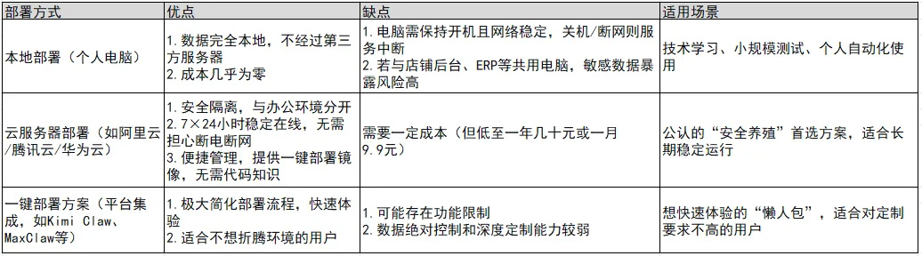 3.一键部署方案:这是为不想折腾环境、想快速体验的用户准备的“懒人包”。Kimi、MiniMax、智普、飞书等平台推出的集成方案(如Kimi Claw、MaxClaw、AutoClaw),极大地简化了部署流程。但对于追求数据绝对控制和深度定制的专业卖家而言,可能存在一定的功能限制。