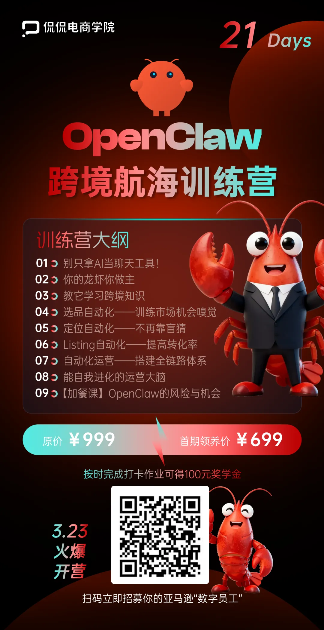 感兴趣的卖家可以扫码查看OpenClaw训练营详情👇👇,🧧首期直降300!名额有限,欲报从速。