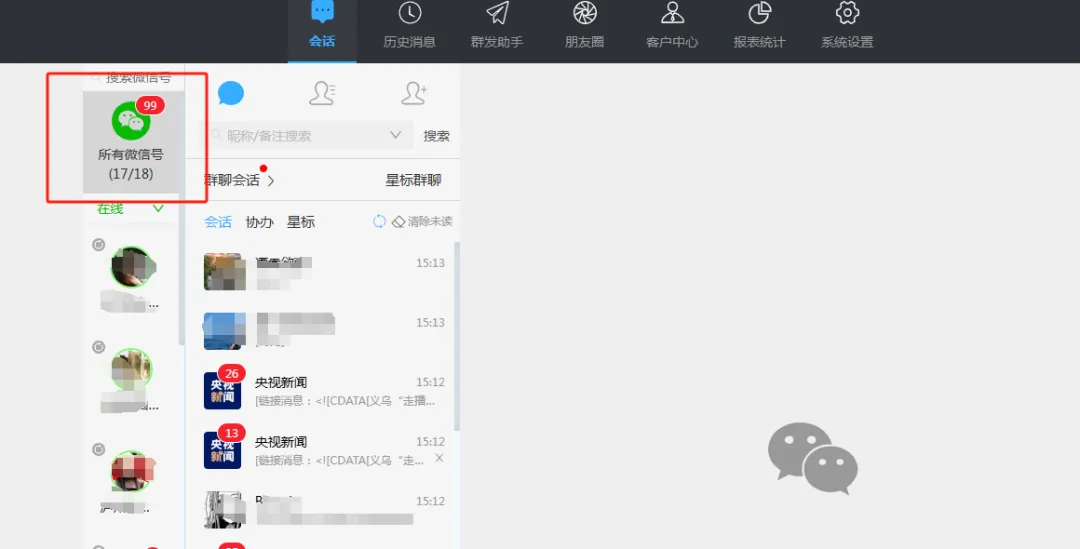 而且,所有聊天窗口都集中在一个界面里。你可以像用微信电脑版一样,左边是联系人列表,中间是聊天窗口,右边可以打开客户资料/朋友圈/快捷话术。不同账号之间的切换,只需要点击一下。