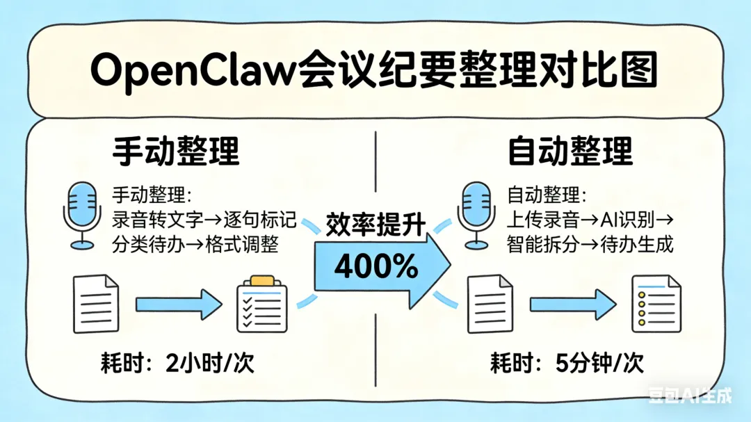 日常痛点:开完会对着录音和手写笔记,逐字逐句整理纪要,还要从中提炼核心内容,拆分待办事项、标注责任人和完成时限,整理完还要反复核对修改。一场1小时的会议,纪要往往要花40分钟甚至更久,效率极低。